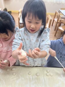 年中さんは自分でころころ丸めるところにも挑戦。「手にくっついちゃう~!」「もちもち気持ち良い~」オリジナリティあふれるお餅が出来上がっていました。