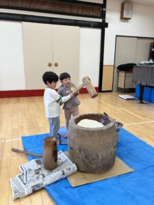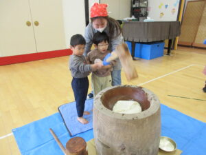 朝から園内はもち米を蒸す、いいにおいが漂い、準備してあるうすと杵を見て、そわそわする子どもたち。