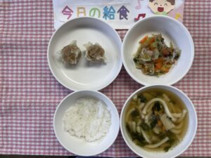 ごはん、かやくうどん、豚しゅうまい、野菜炒め、かやく汁
