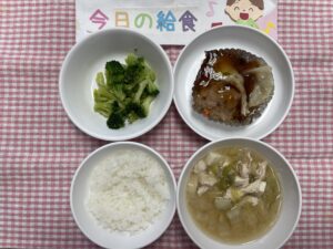 ごはん、はす蒸し風、ゆでブロッコリー、鶏野菜汁