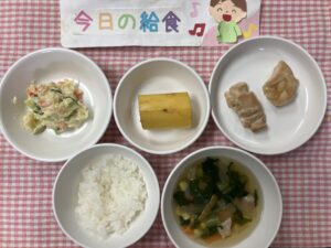 ごはん、鶏肉のみそ焼き、さつまいもサラダ、青菜のスープ、果物
