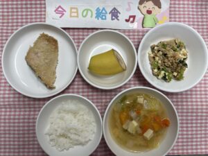 ごはん、鮭のパン粉焼き、納豆和え、かぼちゃのみそ汁、果物