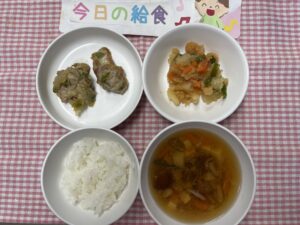ごはん、鶏肉とねぎの照り焼き、カラフルきんぴら、きのこのすまし汁