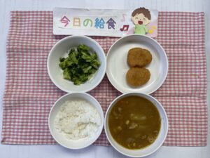 ごはん、カレーシチュー、チキンナゲット、ゆでブロッコリー