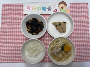 ごはん、魚のおろし煮、五目ひじき、ほうとう
