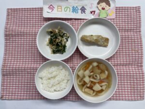 ごはん、魚のみそ焼き、青菜のソテー、年越しうどん汁
