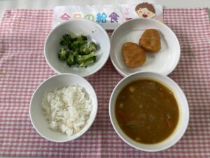 ごはん、肉団子カレーシチュー、チキンナゲット、ゆでブロッコリー