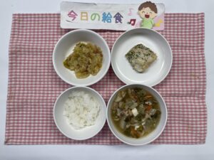 ごはん、魚のマヨネーズ焼き、キャベツのソテー、ちゃんこうどん