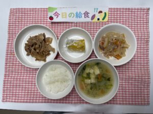 ごはん、豚肉のみそ焼き、きんぴられんこん