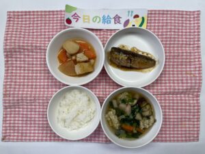 ごはん、いわしの梅煮、里芋のうま煮、かき卵汁