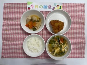ごはん、魚の磯辺フライ、里芋のうま煮、かき卵汁