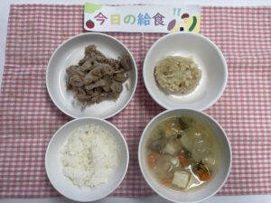ごはん、豚肉の生姜焼き、れんこん天ぷら、わかめの味噌汁