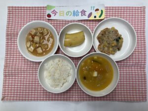 ごはん、えびと野菜のかき揚げ、高野豆腐のあんかけ煮、