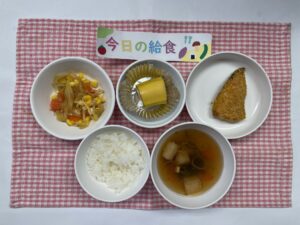 ごはん、魚のコーンフレーク焼、キャベツ和え、菜の花のすまし汁、果物