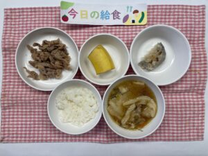 ごはん、豚肉の生姜焼き、れんこん天ぷら、せんべい汁、果物