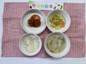 ご飯、肉団子のケチャップ煮、キャベツのソテー、春野菜のクリームシチュー