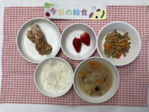 ごはん、鶏肉のから揚げ、豚肉とアスパラの炒め物、切干大根の味噌汁、果物