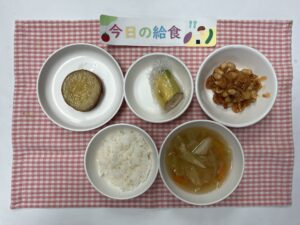 ごはん、チリビーンズ、さつまいものレモン煮、春キャベツのスープ、果物