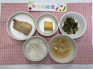 ごはん、鮭のパン粉焼き、ほうれん草の和えもの、じゃがいもの味噌汁、果物