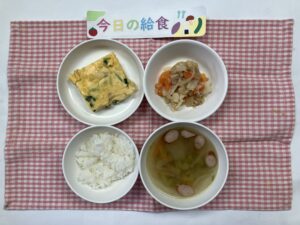 ごはん、じゃがいものキッシュ、ツナのホットサラダ、アスパラのスープ