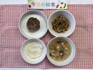ごはん、ハンバーグ、きんぴらごぼう、豚汁