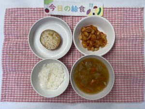 ごはん、チリビーンズ、さつま芋のレモン煮、春キャベツのスープ