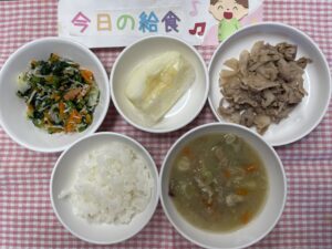 ごはん、豚肉の生姜焼き、しらす和え、