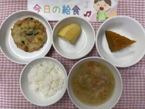 ごはん、わかめのかき揚げ、南瓜の甘煮、鶏野菜汁、果物