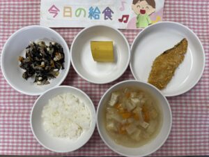 ごはん、鮭のコーンフレーク焼き、健骨サラダ、じゃがいものスープ、果物