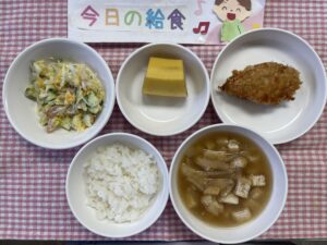 ごはん、魚の磯辺フライ、はるさめサラダ、のっぺい汁、果物