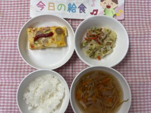 ごはん、スペイン風オムレツ、キャベツのソテー、野菜スープ