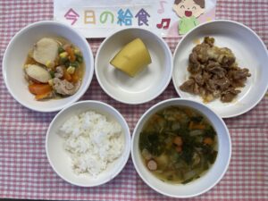ごはん、豚肉のピザ風、里芋と鶏肉の味噌バター煮、
