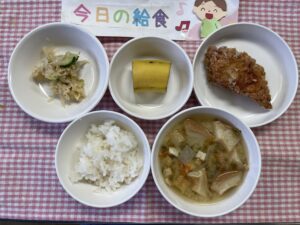 ごはん、魚の竜田揚げ、切り干し大根の中華風酢の物、車麩のみそ汁、果物