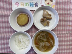 ごはん、鶏肉の照り焼き、さつま芋のレモン煮、せんべい汁、みかん