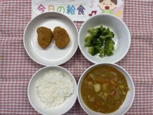 ごはん、カレーシチュー、チキンナゲット、ブロッコリー