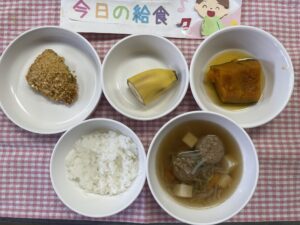 ごはん、鮭のコーンフレーク焼き、かぼちゃの甘煮、肉団子スープ、果物